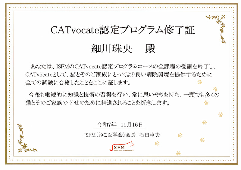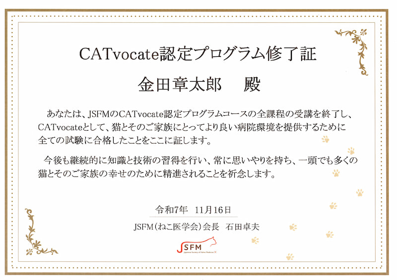 CATvocateとは、CAT(猫)ADVOCATE(専任従事者)から作られた言葉で、猫の診療に必要な基礎知識を学び、猫の扱いに熟知したスタッフを育成するためにJSFM(ねこ医学会)が開始した認定制度です。